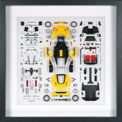 Il vostro modello preferito diventa una vera opera d’arte che potrete appendere alla parete di casa o nel vostro ufficio. Questo esclusivo oggetto riproduce la Ferrari Enzo nella livrea Gialla, in scala 1:24 visualizzata smontata ed accuratamente disposta sul pannello opalino. Ogni pezzo è stato accuratamente preparato in fabbrica e verniciato a mano singolarmente con aerografo da professionisti Tamiya. Anche i più piccoli particolari sono riprodotti e meticolosamente disposti nella corretta posizione. La cornice in legno verniciata include sul fianco destro l’inconfondibile logo Tamiya impresso sulla targhetta in alluminio. Sul retro del pannello è applicato il certificato con numero di serie unico.