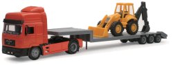 Man f2000 lowboy trailer with backhoe loader
