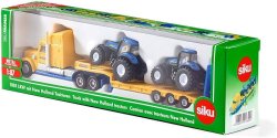 Il grosso camion americano con il design del famoso marchio di trattori New Holland non ha problemi a trainare due grandi trattori della serie T8. Realizzati principalmente in metallo pressofuso, i modelli sono mantenuti nei tipici colori blu e giallo New Holland. Le cabine dei trattori sono rimovibili. Tutti i veicoli con cingoli in gomma e cerchi con dettagli originali.
